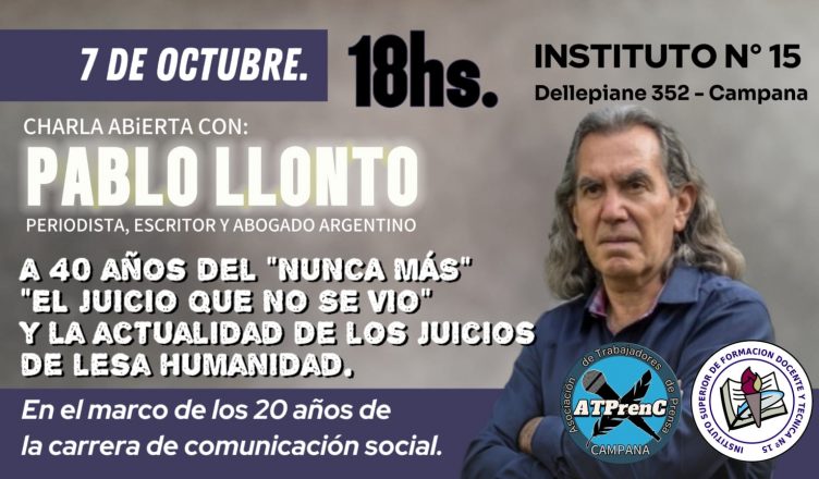 La Asociación de Trabajadores de Prensa de Campana (ATPRENC) y el Instituto Superior de Formación Docente y Técnica N°15 (ISFDyT N°15) invitan a la comunidad a participar de una charla abierta con el destacado periodista, escritor y abogado argentino Pablo Llonto. El encuentro se realizará el próximo lunes 7 de octubre a las 18 horas en la sede del instituto, en el marco de los 20 años de la carrera de Comunicación Social.