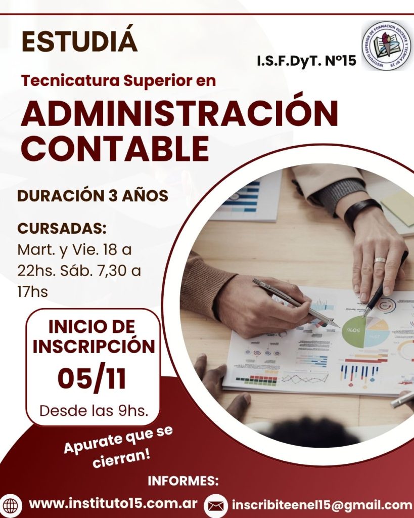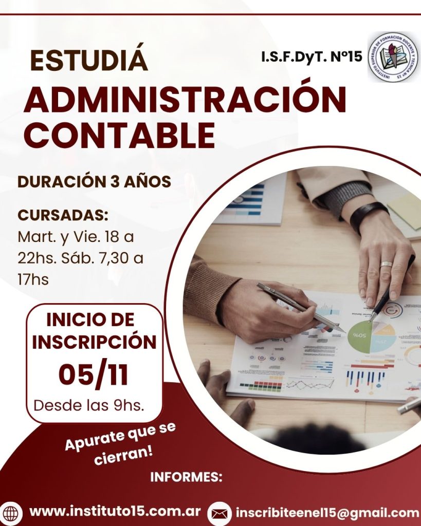 La carrera de Administración Contable dura 3 años y se cursa los días: martes y viernes de 18 a 22:30 y sábados de 7:30 a 17 hs.