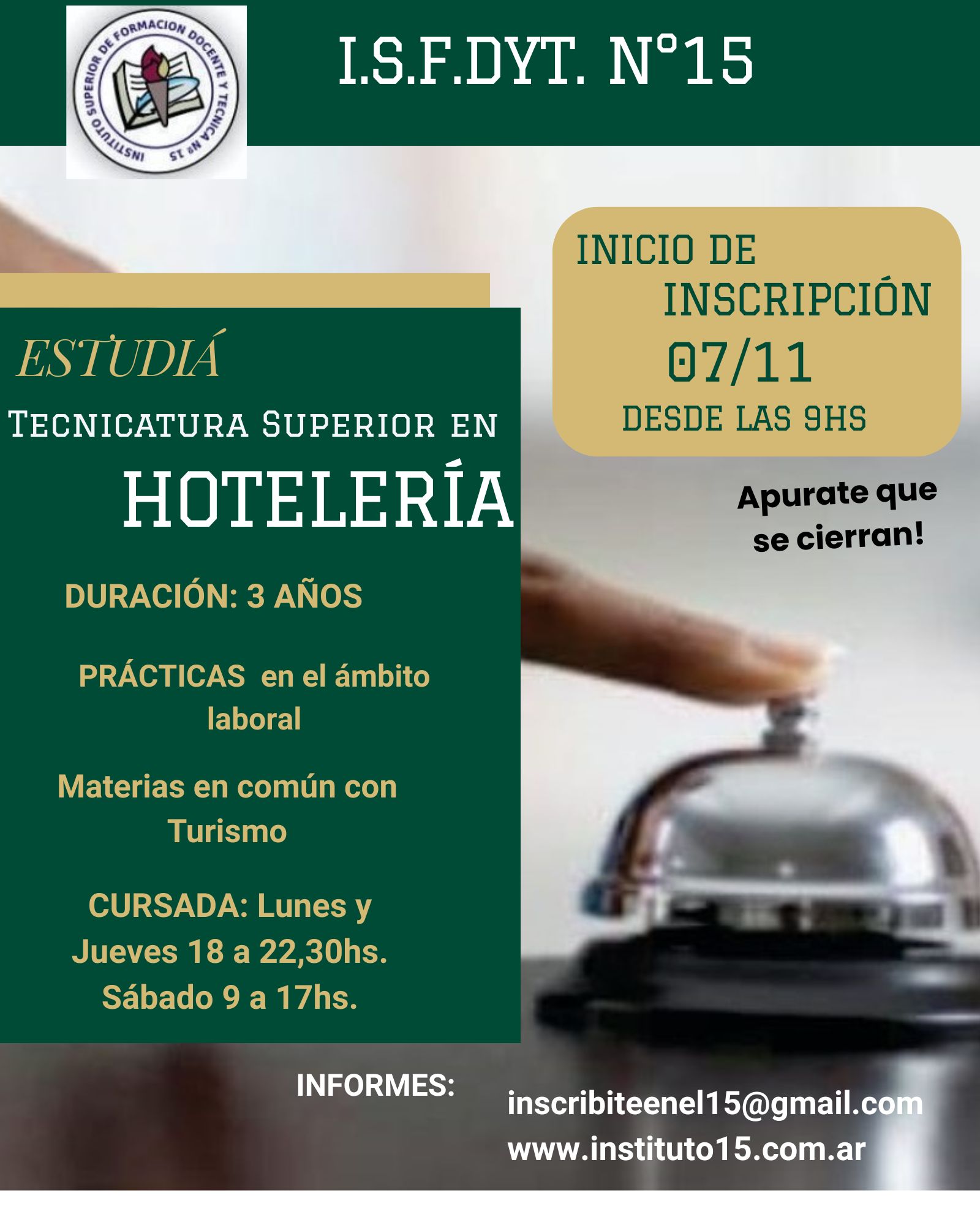 La carrera de Técnico Superior en Hotelería se cursa los días lunes, jueves de 18 a 22:30 y sábados de 9 a 17hs. Con modalidad de materias cuatrimestrales, algunas de cursada libre.
