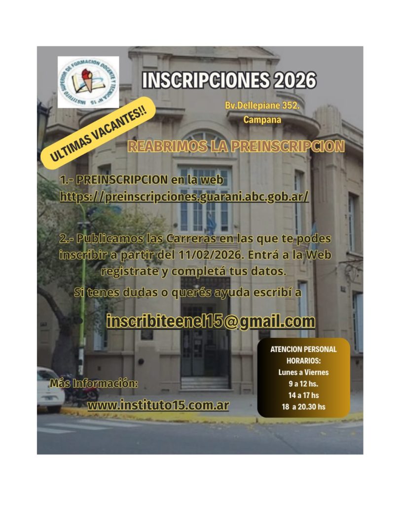 Desde el 11/02 al 07/03 se abre la pre-inscipción para las carreras de Profesorado de Matemática, Geografía, Historia, Electromecánica, Educación Inicial Turno Tarde, Educación Especial y para las tecnicaturas de Tiempo Libre y Recreación, Gestión Cultural, Comunicación Social, Turismo y Hotelería.