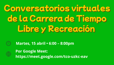 ¡Les invitamos al 1er Conversatorio 2025! Conversatorios virtuales de la Carrera de Tiempo Libre y RecreaciónMartes, 15 abril • 6:00 – 8:00pmZona horaria: