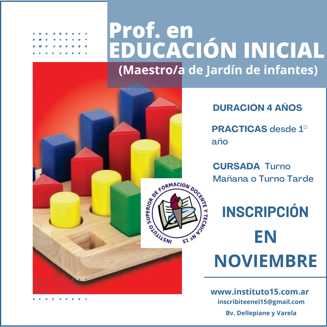 Cursadas presenciales, semipresenciales y libres. El Profesorado en Educación Inicial es la carrera más antigua del Instituto, ya que el comienzo de sus actividades fue el de la institución misma, en 1966. Actualmente, como carrera, es la que congrega mayor cantidad de alumnos. Es la única que tiene comisiones de todas las materias en los tres turnos horarios en que funciona el Instituto. En sus comienzos el formato del plan de estudios era muy diferente. La formación para el Nivel Inicial era apenas un complemento de la que se brindaba para el Nivel Primario. Actualmente, después de la última modificación, la carrera es un profesorado de 4 años de duración. De este modo, se reconoció la especificidad de la formación necesaria. Este profesorado prepara a quienes egresan para desempeñarse en todo el Nivel Inicial, es decir, en sus dos ciclos. El primero de ellos es el que abarca a niñas y niños desde los 45 días y hasta los 2 años de edad. El segundo ciclo, a niñas y niños de 3 a 5 años de edad. La formación que reciben las y los estudiantes tiene como principal eje ordenador a la práctica en las salas de Jardines de Infantes y de Jardines Maternales, tanto de gestión estatal como privada, y de la mayor diversidad de contextos posibles. Esas prácticas se realizan con un acompañamiento constante e intenso, después de haber cumplido con observaciones precisas y diversas tanto de espacios como de situaciones concretas. Previa y simultáneamente, además, se abordan cuestiones teóricas específicas y generales que contribuyen a la formación de las y los estudiantes y a la consolidación de su preparación. Entre las específicas se encuentran las distintas didácticas, la psicología, el juego infantil, arte y educación, confección de materiales didácticos, entre otros.