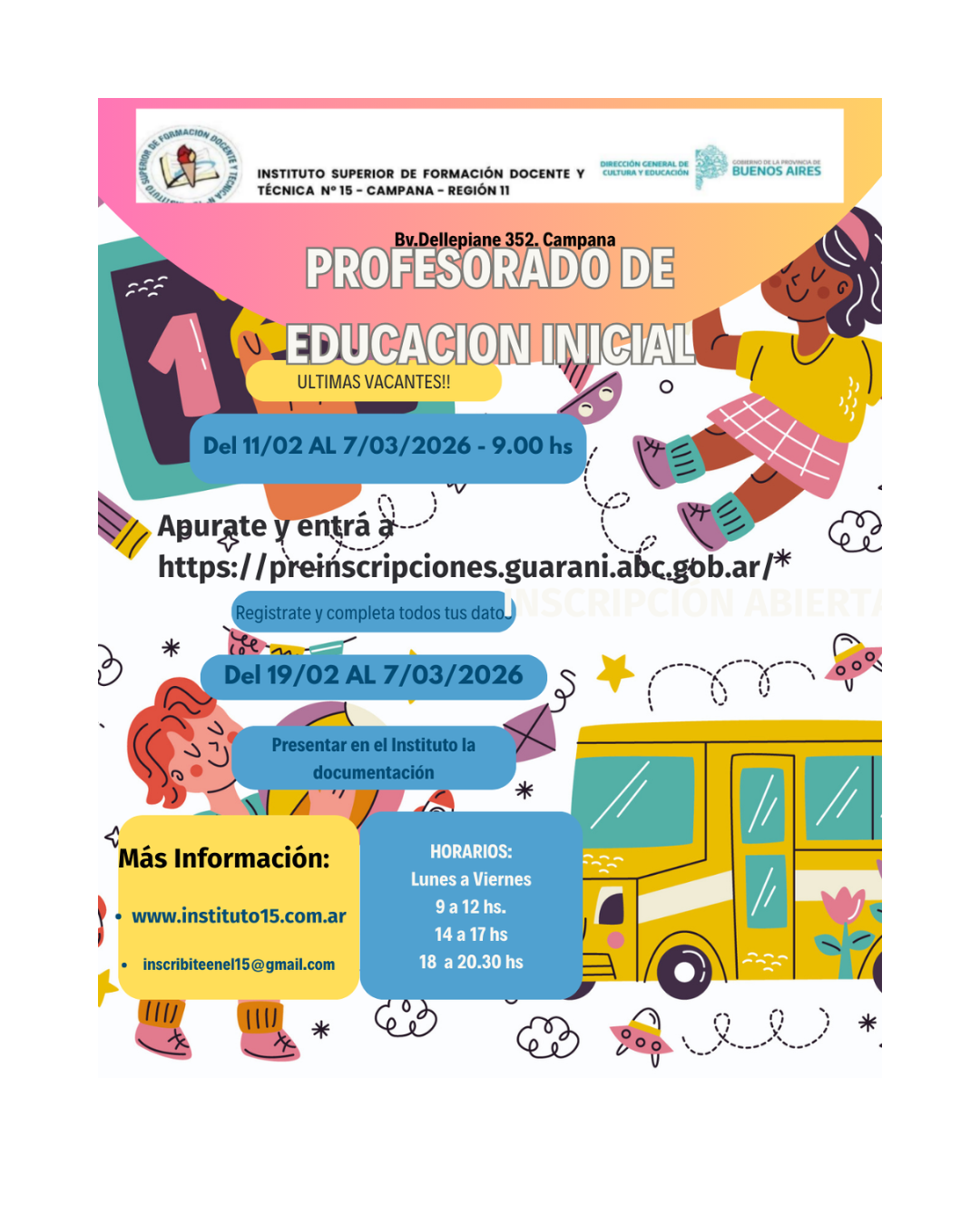 La carrera de Profesorado en Educación Inicial (maestra jardinera) tiene 4 años de duración. Turnos: comisión de turno mañana de lunes a viernes de 8 a 12,30 hs. Comisión de turno tarde de 13 a 17,30 hs. Prácticas a contraturno.